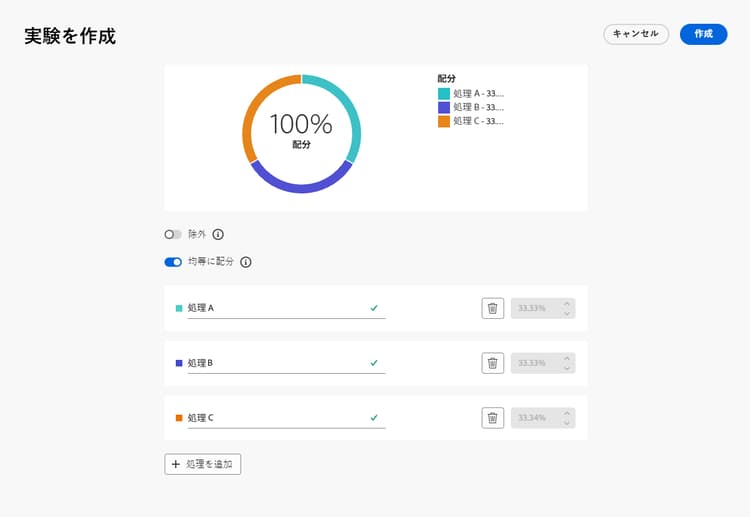各 処理 に正確な割合を割り当てるか、等しく分布切り替えバーをオンにすることができます。