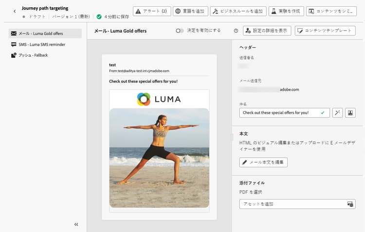 ジャーニーに戻り、特定のアクションをドロップして各パスをカスタマイズします。例えば、ゴールドロイヤルティメンバー向けにパーソナライズされたオファーを含むメールを作成し、他のすべてのメンバー向けには SMS リマインダーを作成します。