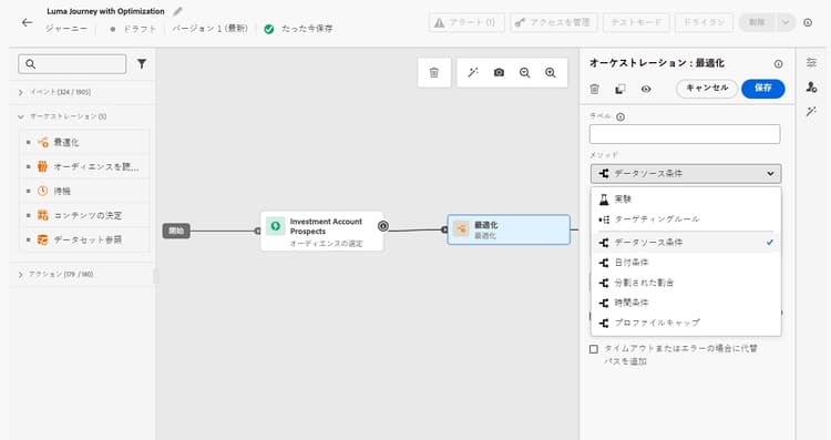 「オーケストレーション」セクションから、最適化アクティビティをジャーニーキャンバスにドラッグ&ドロップします。