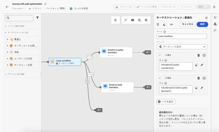 最適化アクティビティでは、実験、ターゲティング、特定の条件など、特定の条件に基づいて複数の パス を作成することで、個人がジャーニーをどのように進めるかを定義できます。これにより、最大限のエンゲージメントと成功が確保され、高度にカスタマイズされた効果的なジャーニーを作成できます。