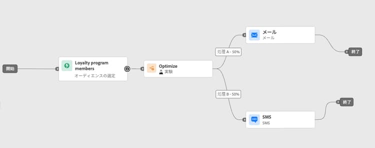 最初のメッセージをメールで送信した場合と SMS で送信した場合のどちらがコンバージョン率が高くなるかをテストします。