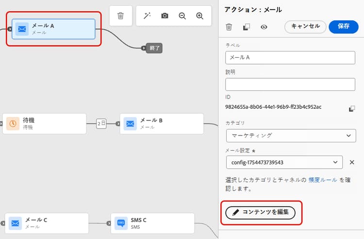 チャネルアクションを選択し、「コンテンツを編集」ボタンを使用して、デザインツールにアクセスします。