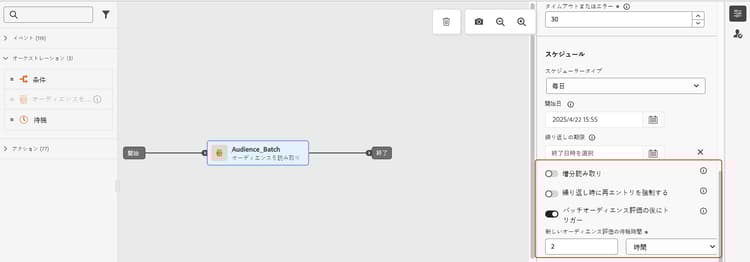 毎日スケジュールされ、バッチオーディエンスをターゲティングするジャーニーの場合、バッチセグメント化ジョブからの新しいオーディエンスデータを待機するジャーニーの時間枠を最大 6 時間まで定義できます。セグメント化ジョブが時間枠内に完了すると、ジャーニーがトリガーされます。それ以外の場合は、次回の実行までジャーニーはスキップされます。このオプションにより、正確かつ最新のオーディエンスデータを使用してジャーニーが実行されます。
