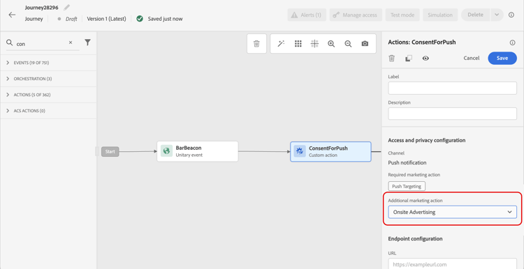 - ジャーニーでカスタムアクションを追加する際に、追加のマーケティングアクションを定義します。詳しくは、ジャーニーでカスタムアクションを追加する際の同意ポリシーを活用する方法を参照してください。