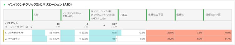 信頼下限:選択した信頼区間内での、処理とベースライン間のコンバージョン率の差の最小推定値。