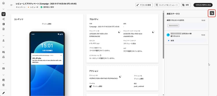 ジャーニーまたはキャンペーンに適用される承認ポリシーで定義された承認者が通知を受け取ります。ジャーニーまたはキャンペーンのコンテンツ、オーディエンス、設定を確認できます。変更が必要な場合は、承認者がリクエストし、キャンペーンを修正用に「ドラフト」に戻します。準備ができている場合は、ジャーニーまたはキャンペーンをアクティブ化して開始できます。リクエストのレビューと承認の方法について学ぶ