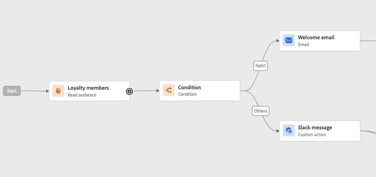 新しいジャーニーモデルでは、Adobe Experience Cloud ソリューションおよびアプリエコシステム内にシームレスに収まり、直感的で効率的なユーザーエクスペリエンスを実現する、新しく改善された ジャーニーキャンバス UI を導入します。 新しいモデルでのジャーニーは、すべて新しいデザインを使用することになります。