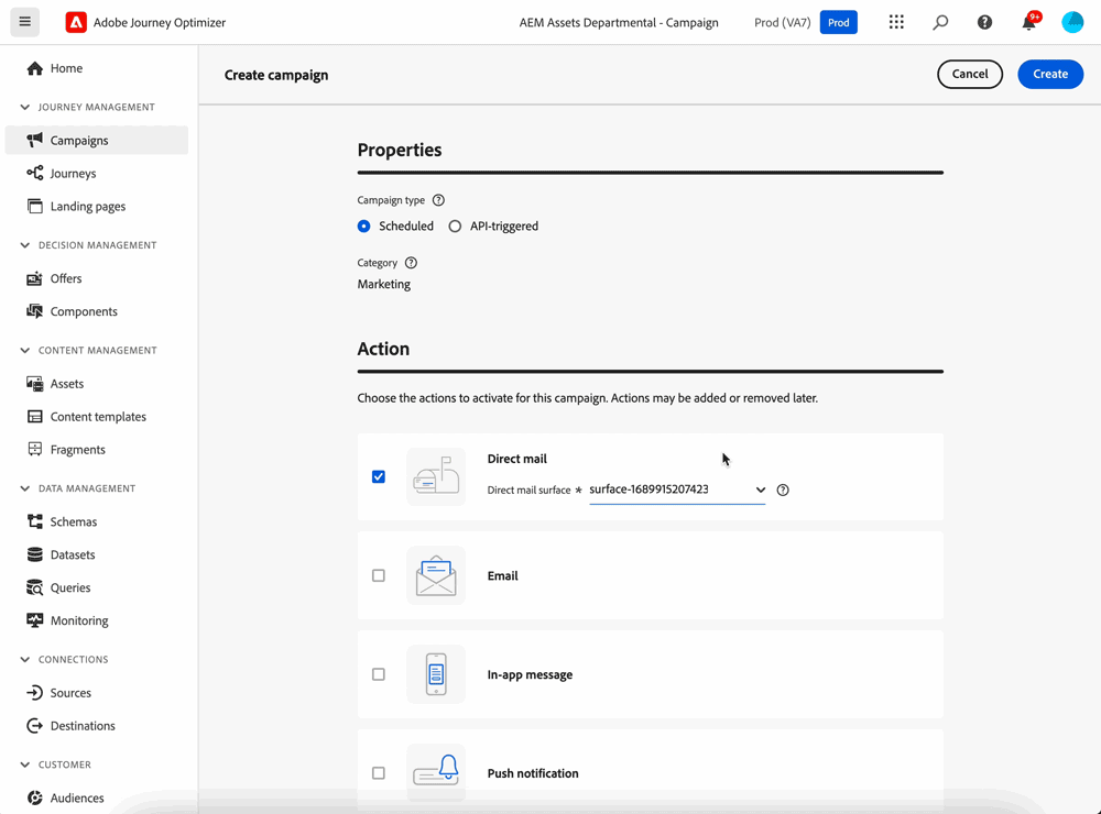キャンペーンにダイレクトメールメッセージを追加できるようになりました。ダイレクトメールは、ダイレクトメールプロバイダーが顧客にメールを送信するために必要なファイルをパーソナライズおよび生成できるオフラインチャネルです。
