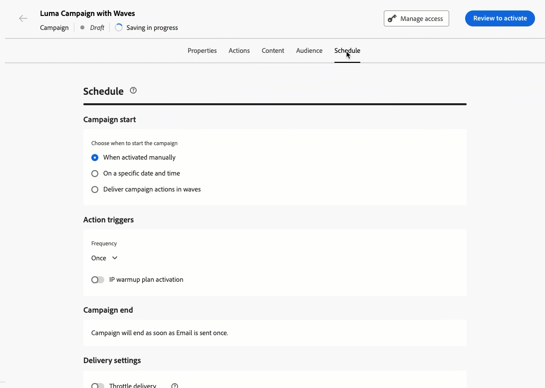 Journey Optimizer キャンペーンまたはジャーニーからのメッセージが制御されたバッチで時間の経過と共に配信されるようにスケジュールできるようになりました。