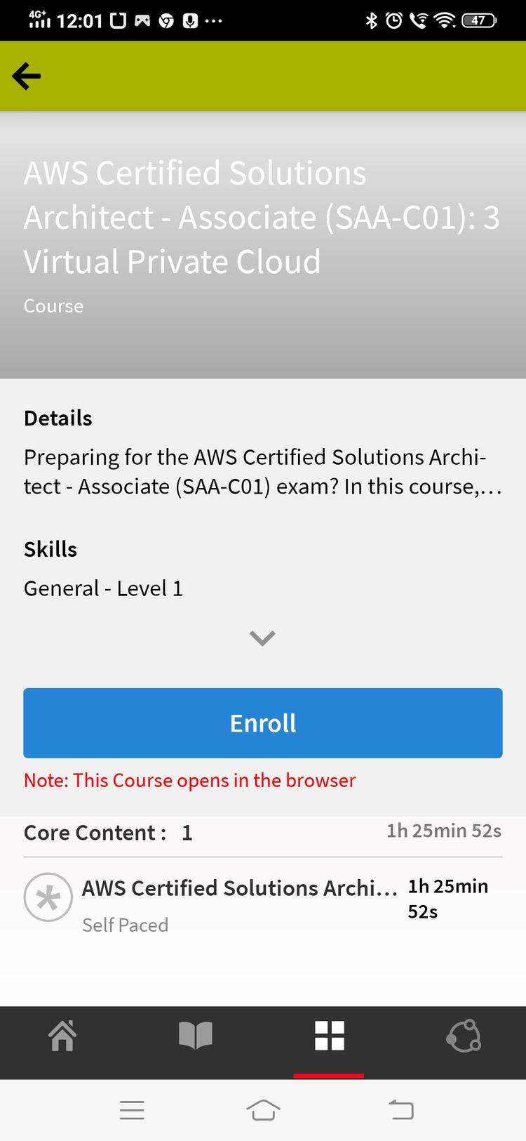 画面下部のブックアイコンの横にあるアイコンをタップします。 カタログと関連するすべての学習目標がすぐに表示されます。 グリッドレイアウトで表示するか、詳細ビューを選択できます。 推奨事項を選択すると、学習履歴に基づいた推奨コースが表示されます。