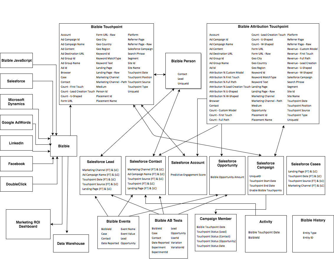 各矢印は、オブジェクトと他のオブジェクトとの関係を表します。 例えば、Marketo Measure Person が標準の Salesforce リードオブジェクトのフィールドに入力されていることがわかります。 矢印が指している場合は、矢印の受信側に入力されていることを意味します。