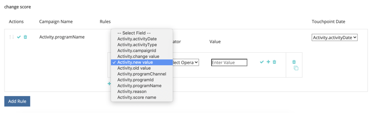 アクティビティタイプごとに、タッチポイントの対象となるレコードを決定する 1 つ以上のルールを定義する必要があります。 この例では、「スコアを変更」アクティビティタイプにルールを追加して、Marketo ユーザーのスコアが 90 以上に達した場合にタッチポイントが作成されるようにします。