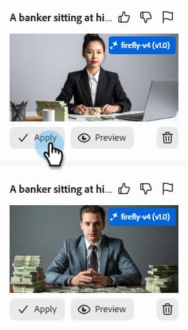 バリエーションを選択するには、そのチェックボックスを選択し、選択をクリックします。 調整をクリックして調整することもできます。 さらに、「サムズアップ」アイコンまたは「サムズダウン」アイコンをクリックして、生成AIがユーザーの好みを学習できるようにフィードバックを提供することもできます。