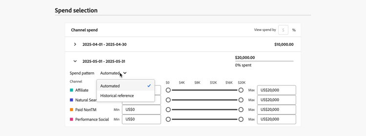 各チャネルの予算を定義するには、Min と Max の値を入力するか、スライダーを使用します。