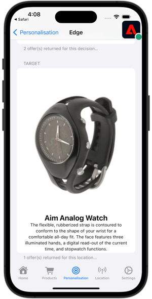 一番下までスクロールすると、A/B テストで定義した 2 つのオファーのいずれかが TARGET タイルに表示されます。