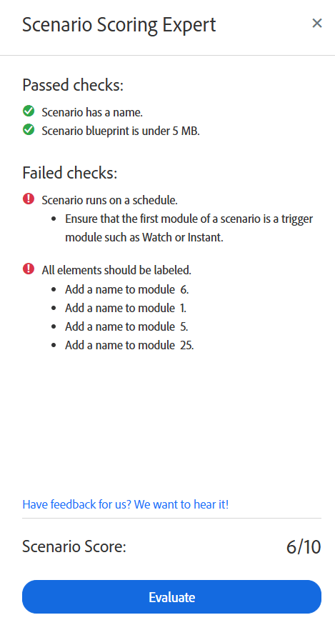 シナリオスコアリングエキスパートは、ベストプラクティスに従ってシナリオが確実に設定されるようにするのに役立ちます。 シナリオをチェックし、構造と組織に関する推奨事項を提供します。