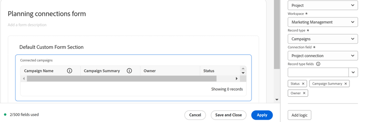 すべてのオブジェクトのカスタムフォームに「計画接続」フィールドを追加できます。 ただし、接続されたレコードを表示できるのは、Workfront Planning から接続できる、Workfrontオブジェクトに関連付けられたカスタムフォームのみです。