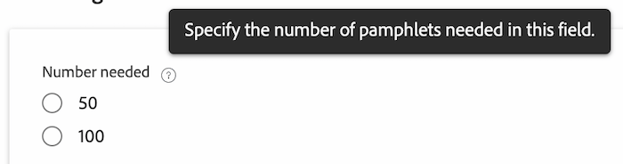 手順 ウィジェットに関する追加情報を入力します。ユーザーがカスタムフォームに入力する際は、疑問符アイコンの上にマウスポインターを置くと、ここに入力した情報を含むツールチップが表示されます。
