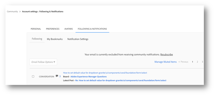 また、通知設定は、アカウント設定 を通じて管理することもできます。「フォローと通知設定」 に移動して、購読している内容を確認および調整します。そこから、特定の製品、スレッド、投稿者の 購読または購読解除 を選択し、更新情報の受信方法(メール、プラットフォーム内アラートまたはその両方)を選択できます。