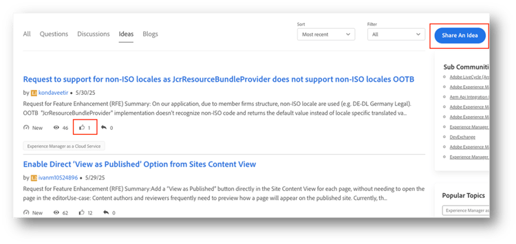 アイデアを共有または賛成票を投じる