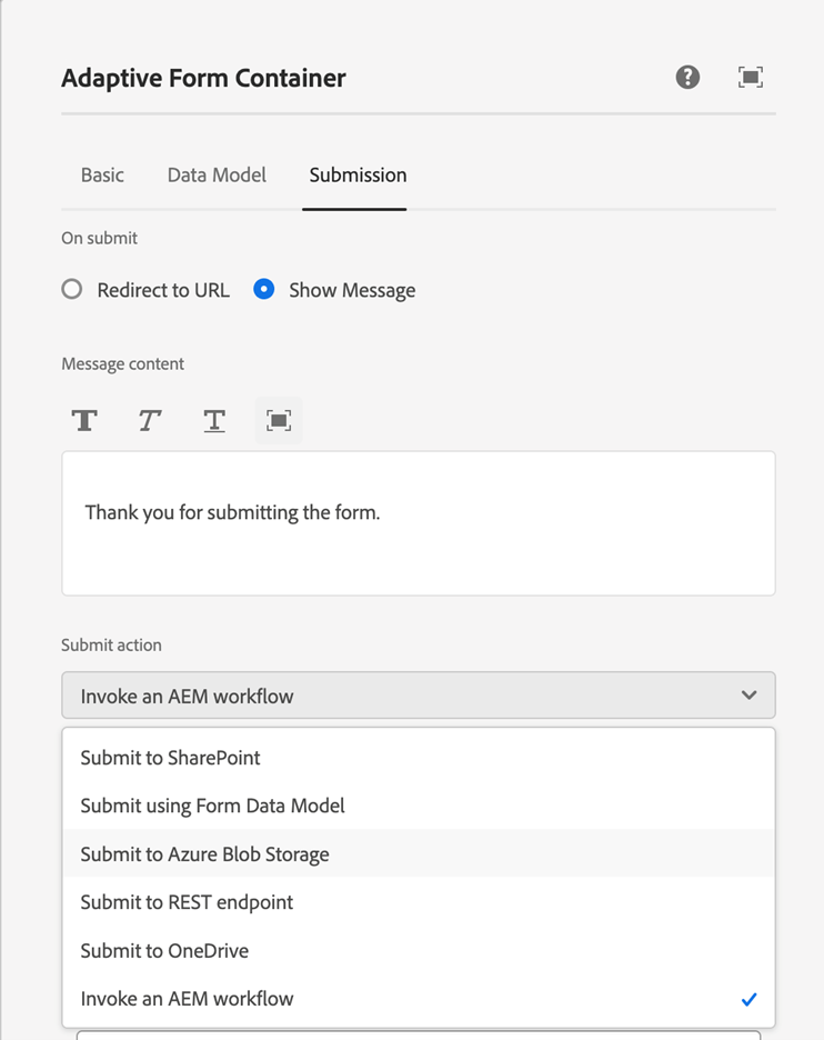 - 送信設定:REST エンドポイントにデータを送信したり、AEM ワークフローをトリガーして自動化されたアクションを実行したりできます。