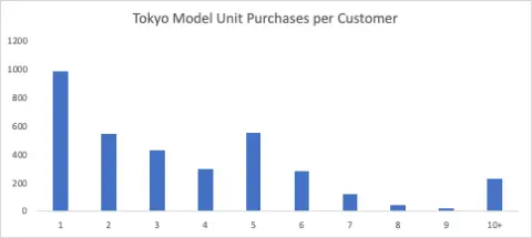X 軸の下部には、顧客ごとに購入した個数があります。最初のバーは顧客が 1 個購入した頻度を表し、2 番目のバーは 2 個購入した顧客数を示します。このようにして、10 個以上を購入した顧客数まで示されます。