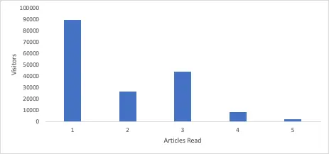 おそらくあなたは、人々がサイトにとどまって、記事を読んでほしいと思っているでしょう。様々な数の記事を読んだ訪問者の数を示すヒストグラムは、エンゲージメントレベルに関するインサイトを提供します。なぜこれが役に立つのでしょうか。例えば、ほとんどの訪問者が記事を 1 つ読んでサイトを離れるのに対し、とても熱心な訪問者は記事を 3 つ読んで離れることがわかったとしたら、それは素晴らしい情報です。これで、訪問者にもう 1 つ記事を読ませることを目標に、1 番目と 3 番目に読まれている記事のページをパーソナライズする必要があることがわかりました。