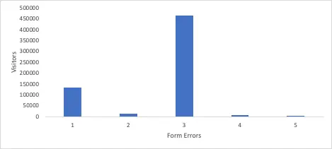 フォームのエラーメッセージは別の問題です。これらは訪問者のエラーで、サイト側のエラーではありません。ただし、何人の訪問者が何個のエラーを経験しているのかを示すヒストグラムからメリットを得ることができます。多数の訪問者が多数のエラーを経験していることを示すヒストグラムが表示される場合は、訪問者が原因ではない可能性があります。これは、フォームに不適切な名前のフィールドや不明確な手順が含まれていることや、必須フィールドが非表示にされているデザインを示唆する優れた指標です。