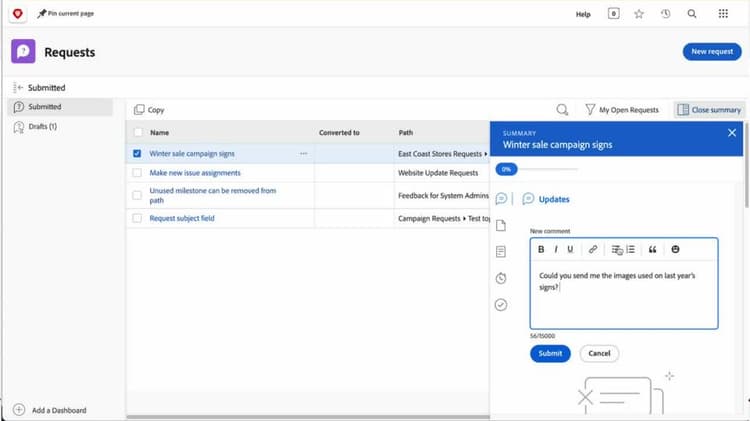フィルターを使用してリクエストを検索し、ステータスと詳細を効率的に更新し、完全な情報にアクセスし、効率化されたワークフローの一元化された共同作業を促進することで、Workfront でのリクエスト管理を簡素化します。