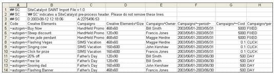 예를 들어 Campaigns^Owner은(는) Campaign Owner 값을 포함하는 열의 열 머리글입니다. 마찬가지로 Creative Elements^Size은(는) Size 분류의 Creative Elements 하위 분류를 포함하는 열에 대한 열 머리글입니다.