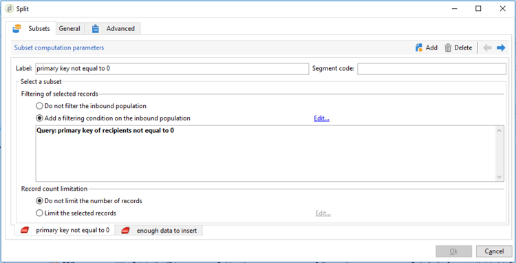 Subsets 탭의 첫 번째 하위 집합에서 인바운드 모집단에 필터링 조건을 추가하여 받는 사람 기본 키가 0이 아닌 레코드만 선택합니다. 이렇게 하면 데이터베이스의 수신자와 조정된 파일의 데이터가 해당 하위 집합에서 선택됩니다.