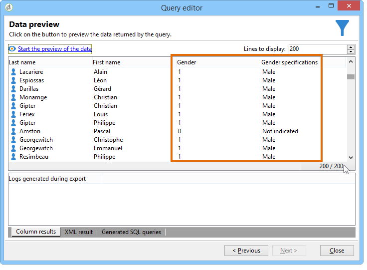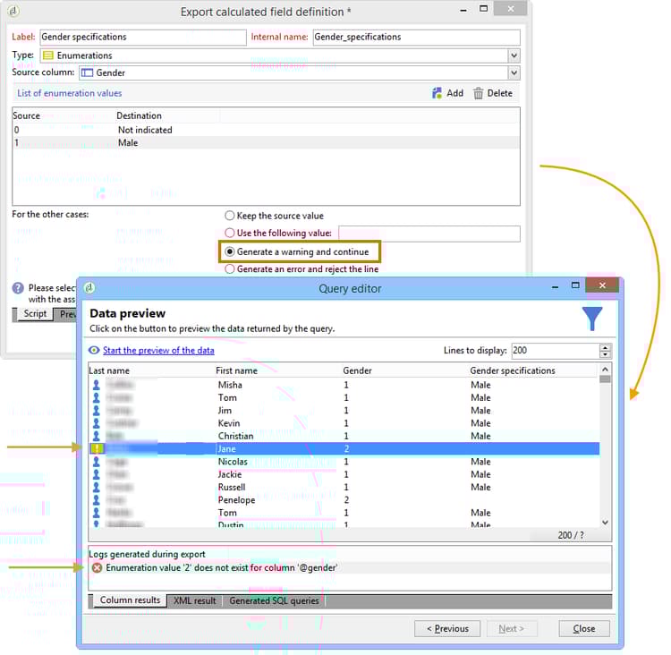 예를 들어 List of enumeration values 에 성별 "2"를 입력하지 않고 In other cases 필드의 Generate a warning and continue 함수를 선택하면 경고 로그가 표시됩니다. 이 로그는 성별 "2"(여성)가 입력되지 않았음을 나타냅니다. 데이터 미리 보기 창의 Logs generated during export 필드에 표시됩니다.