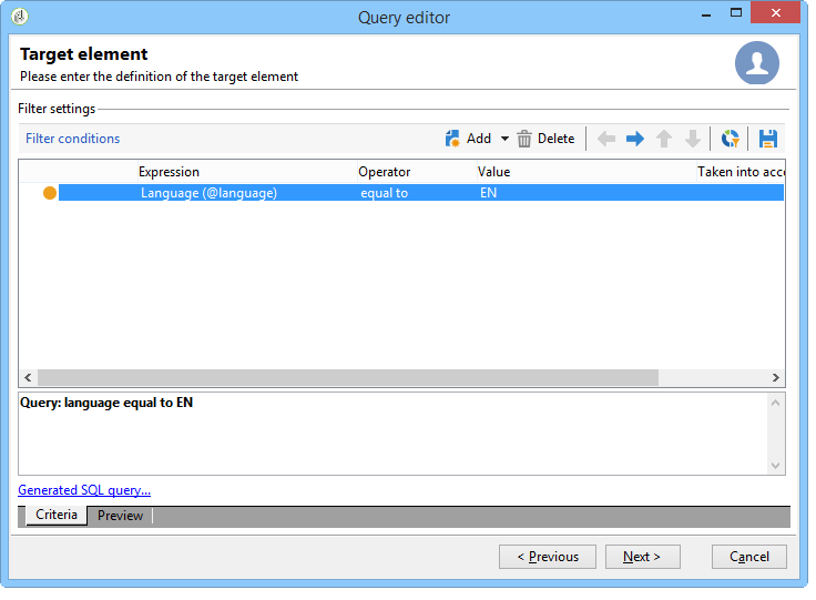 Target element 창에서 필터 조건을 설정하여 영어를 사용하는 수신자를 수집합니다.