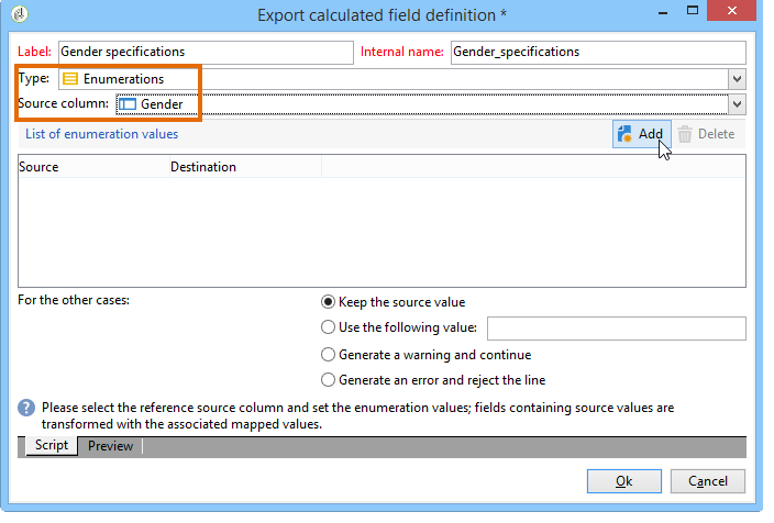 입력할 각 "source-destination" 줄에 대해 List of enumeration values 에서 Add 을(를) 클릭합니다.