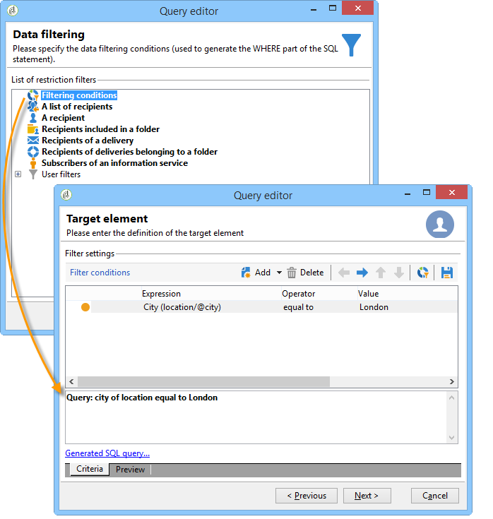 데이터 필터링을 구성합니다. 여기서는 런던에 거주하는 연락처로 선택을 제한합니다.