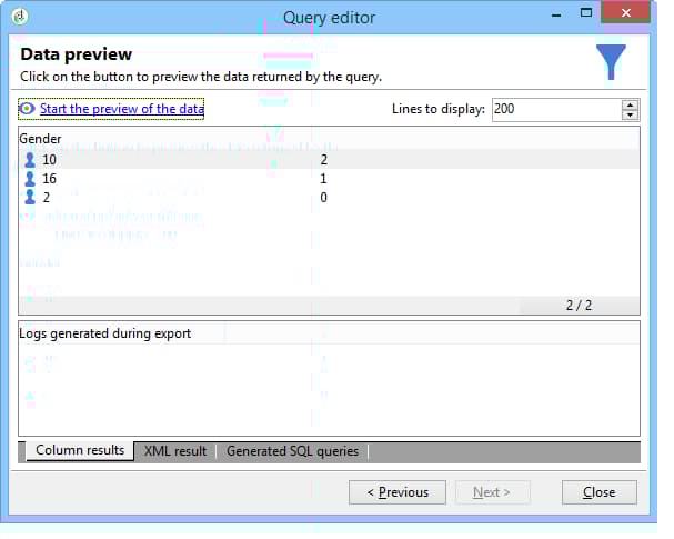 Data to extract 에서 기본 키의 개수를 정의합니다(이전 예제와 같이). 출력 열에 Gender 필드를 추가합니다. Gender 열에서 Group 옵션을 선택하십시오. 이렇게 하면 수신자를 성별에 따라 그룹화합니다.