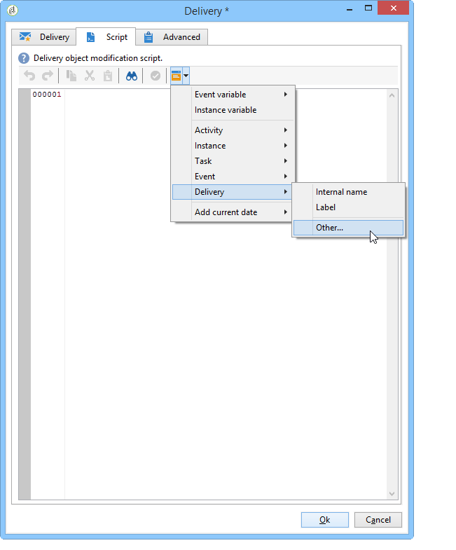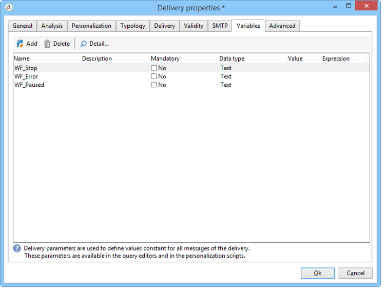 code language-none delivery.variables._var[0].stringValue = vars.strWorkflowError; delivery.variables._var[1].stringValue = vars.strWorkflowPaused; delivery.variables._var[2].stringValue = vars.strWorkflowStop;