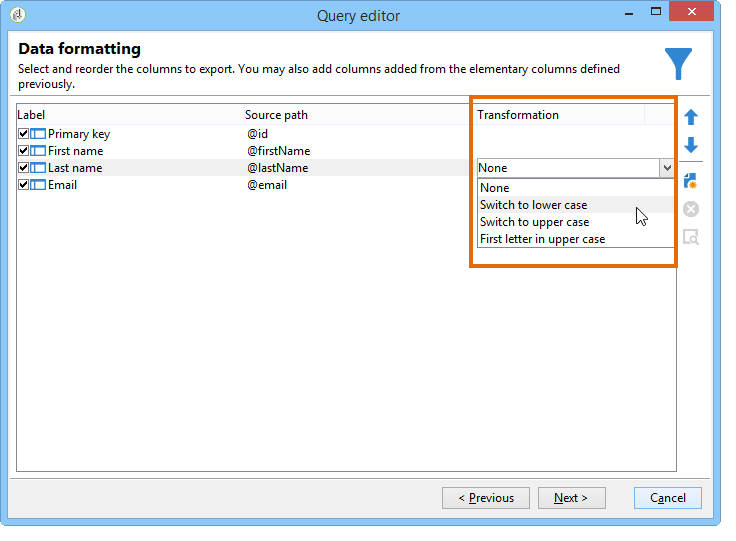 Data formatting 창에서 성을 대문자로 전환합니다. Transformation 열에서 Last name 줄을 클릭하고 드롭다운 메뉴에서 Switch to upper case을(를) 선택합니다.