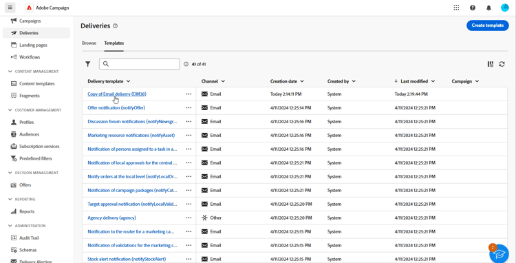 채널로 이메일 또는 푸시 알림 을 선택하고 목록에서 게재 템플릿을 선택합니다.