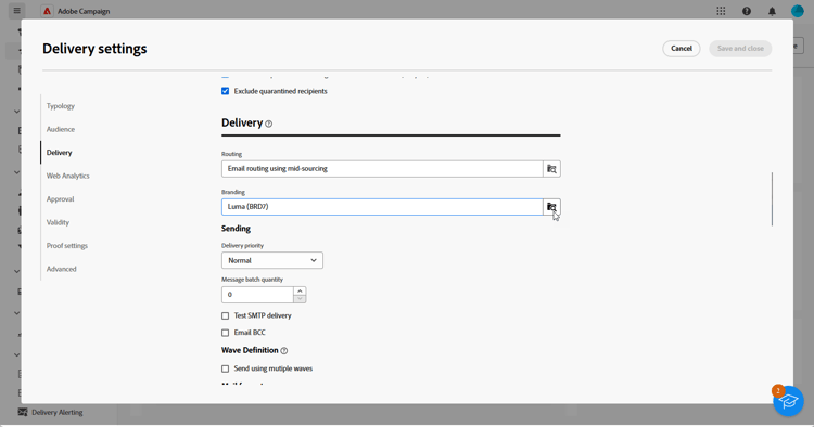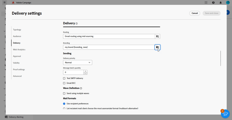 배달 탭에서 브랜딩 필드에 액세스합니다.