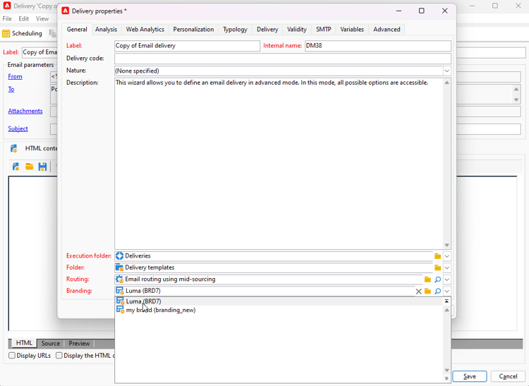 게재 탭에서 브랜딩 필드에 액세스하고 템플릿에 연결할 브랜드를 선택합니다.