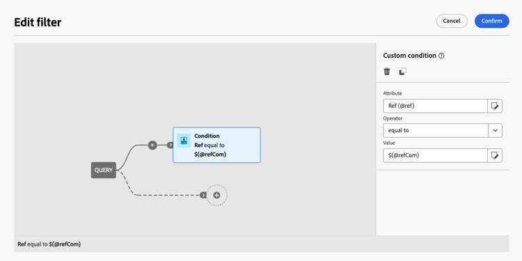 $(<field-name>)구문을 사용하여 조건의 다른 필드에 입력한 값을 참조할 수도 있습니다. 이렇게 하면 아직 데이터베이스에 저장되지 않은 경우에도 양식에 입력한 대로 필드의 현재 값을 참조할 수 있습니다.아래 예에서 조건은 @ref 필드의 값이 @refCom 필드에 입력한 값과 일치하는지 확인합니다. 반대로
