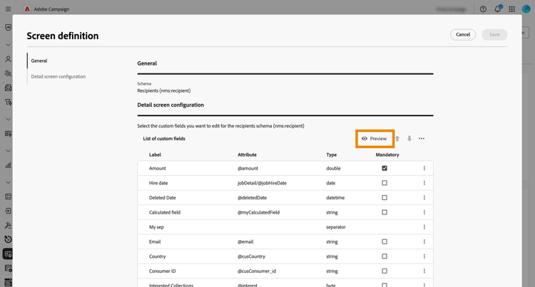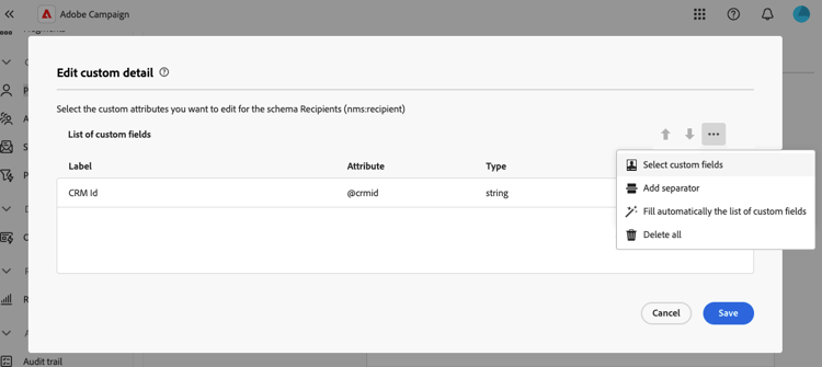 사용자 지정 필드는 Adobe Campaign 콘솔을 통해 기본 스키마에 추가된 추가 속성입니다. 조직의 요구 사항에 맞게 새 속성을 포함하여 스키마를 사용자 지정할 수 있습니다. Adobe Campaign v8 설명서에서 스키마를 확장하는 방법을 알아보세요.