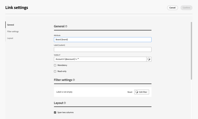 필터 설정(링크 유형 필드의 경우): 쿼리 모델러를 사용하여 링크 유형 사용자 지정 필드를 표시하는 규칙을 지정합니다. 예를 들어 다른 필드의 입력에 따라 목록 값을 제한합니다.