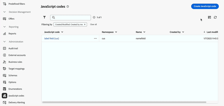 이제 Adobe Campaign Web 사용자 인터페이스에서 JavaScript 코드를 만들 수 있습니다. 이를 통해 라이브러리처럼 여러 워크플로에서 활용할 수 있는 재사용 가능한 함수를 만들 수 있습니다.