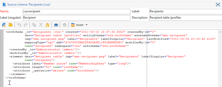 code language-none <srcSchema created="YYYY-MM-DD" desc="Recipient table" extendedSchema="nms:recipient" img="nms:recipient.png" label="Recipients" labelSingular="Recipient" lastModified="YYYY-MM-DD" mappingType="sql" name="recipient" namespace="cus" xtkschema="xtk:srcSchema"> <element desc="Recipient table" img="nms:recipient.png" label="Recipients" labelSingular="Recipient" name="recipient"> <attribute label="Member since" name="MembershipYear" type="long"/> <attribute length="50" name="lastName"/> <attribute _operation="delete" name="birthDate"/> </element> </srcSchema> -