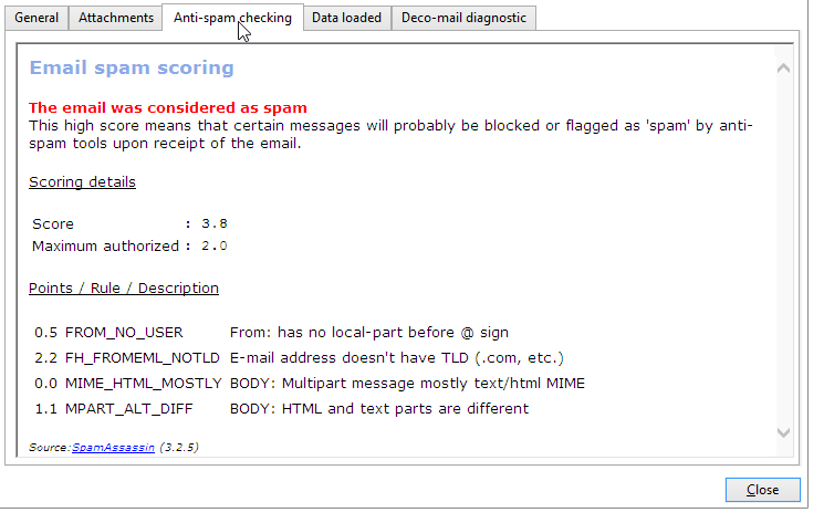Adobe Campaign은 이메일 스팸 필터링에 사용되는 서드파티 서비스인 SpamAssassin에서 작동하도록 구성할 수 있습니다. 이를 통해 이메일에 점수를 매겨 수신 시 사용되는 스팸 방지 도구에 의해 메시지가 스팸으로 간주될 위험이 있는지 여부를 확인할 수 있습니다.