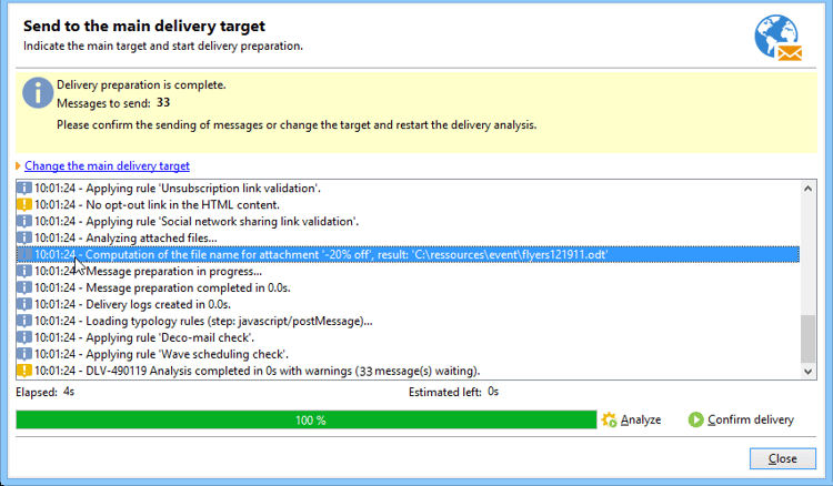 게재를 준비하는 동안 첨부 파일 이름을 계산할 수 있습니다. 이렇게 하려면 The file name is calculated during delivery analysis (it cannot depend on the recipient) 옵션을 선택하십시오.