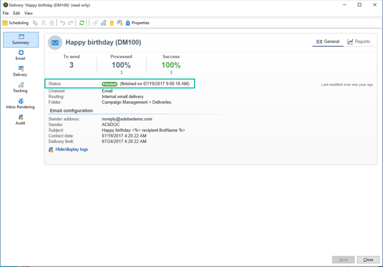 전자 메일 게재의 경우 메시지가 Campaign에서 MTA(메일 전송 에이전트)로 전달되었습니다.