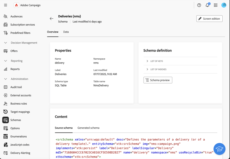 Campaign 탐색기에서 관리 > 구성 > 데이터 스키마를 선택합니다.